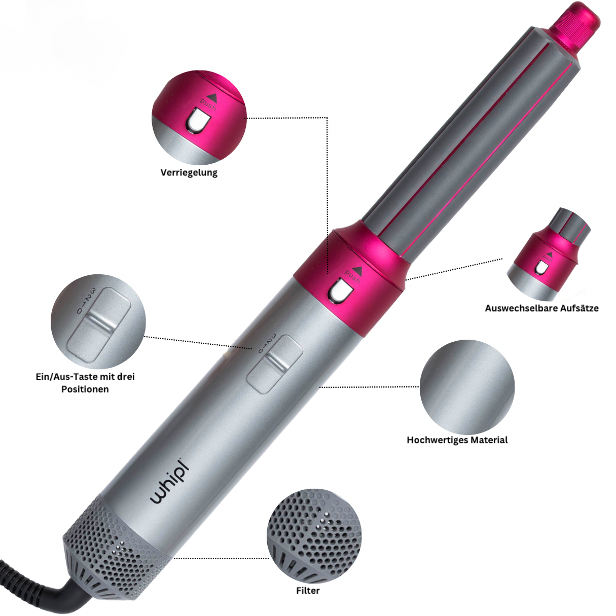 The Whipl™ AirStyler robi całość praca dla ciebie! Przełącza się z jednego trybu na drugi, czy tak jest Suche, Wygładzanie, Loki magia lub Fale twórz, używając 5 różnych załączników w jednym Naciśnij przycisk zmienić - Niesamowite, prawda?